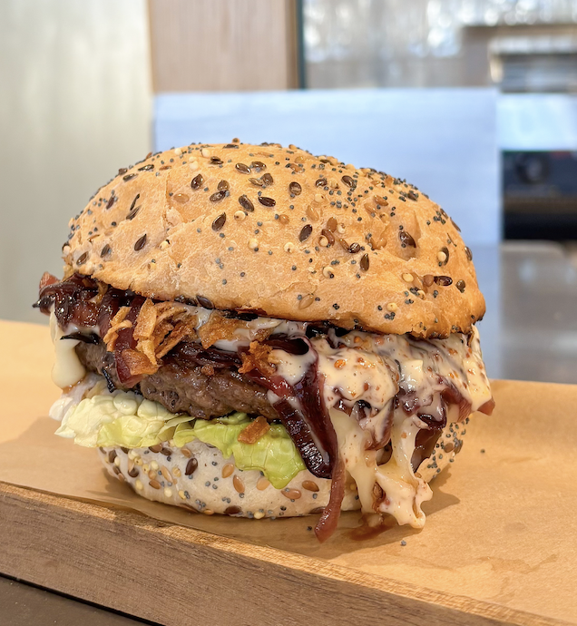 Pain aux graines, steak de 125g VBF, cheddar, sauce maison, salade, tomate, oignons, oignons confits, pickles
