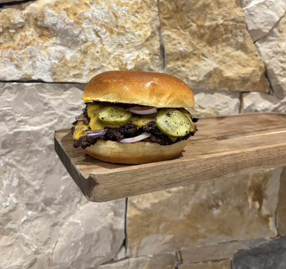 Pain brioché, double steak smashé VBF, ketchup, moutarde, oignons, pickles