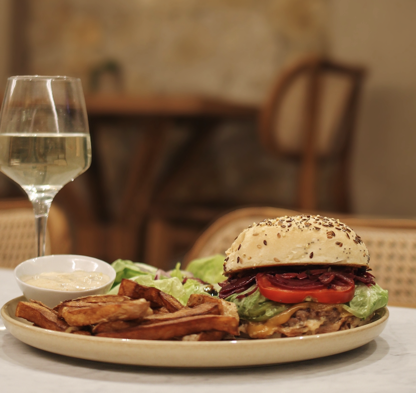 Pain aux graines, steak de 125g VBF, fromage à raclette, sauce moutarde à l’ancienne, salade, oignons, pickles, oignons confits